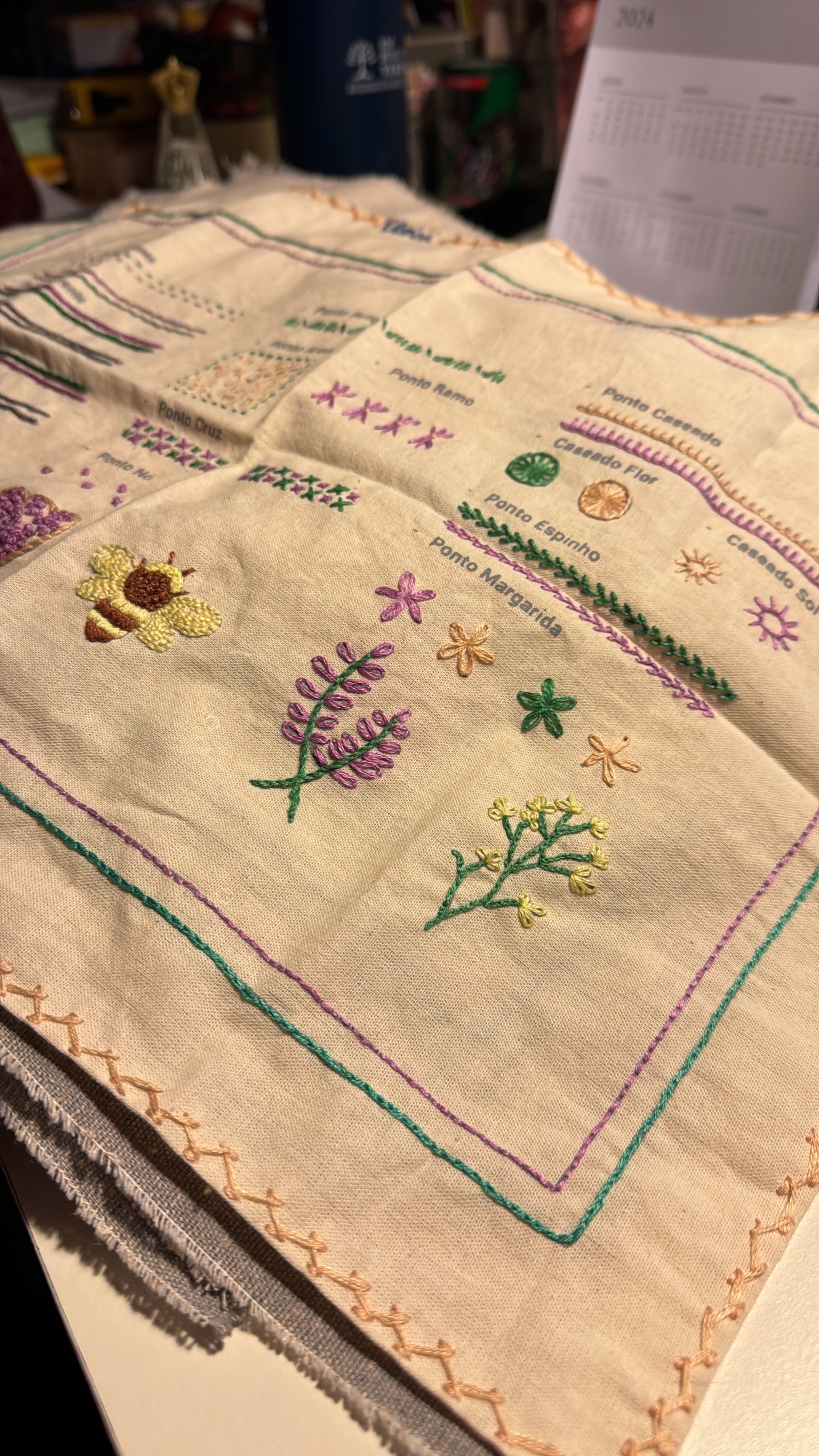 Oferecemos oficinas de bordado livre em dois níveis, cada um com 14 semanas de aulas, nas quais as participantes aprendem mais de 30 técnicas de agulha e linha, incluindo aplicação de paetês, miçangas e pontos decorativos — unindo o bordado tradicional a abordagens contemporâneas.